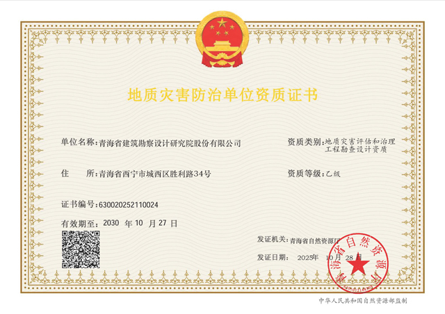 近日,公司獲得由青海省自然資源廳頒發(fā)的“地質災害評估和治理工程勘查設計資質(乙級)”,標志著公司在地質災害防治領域的業(yè)務能力和專業(yè)實力邁上新的臺階。
